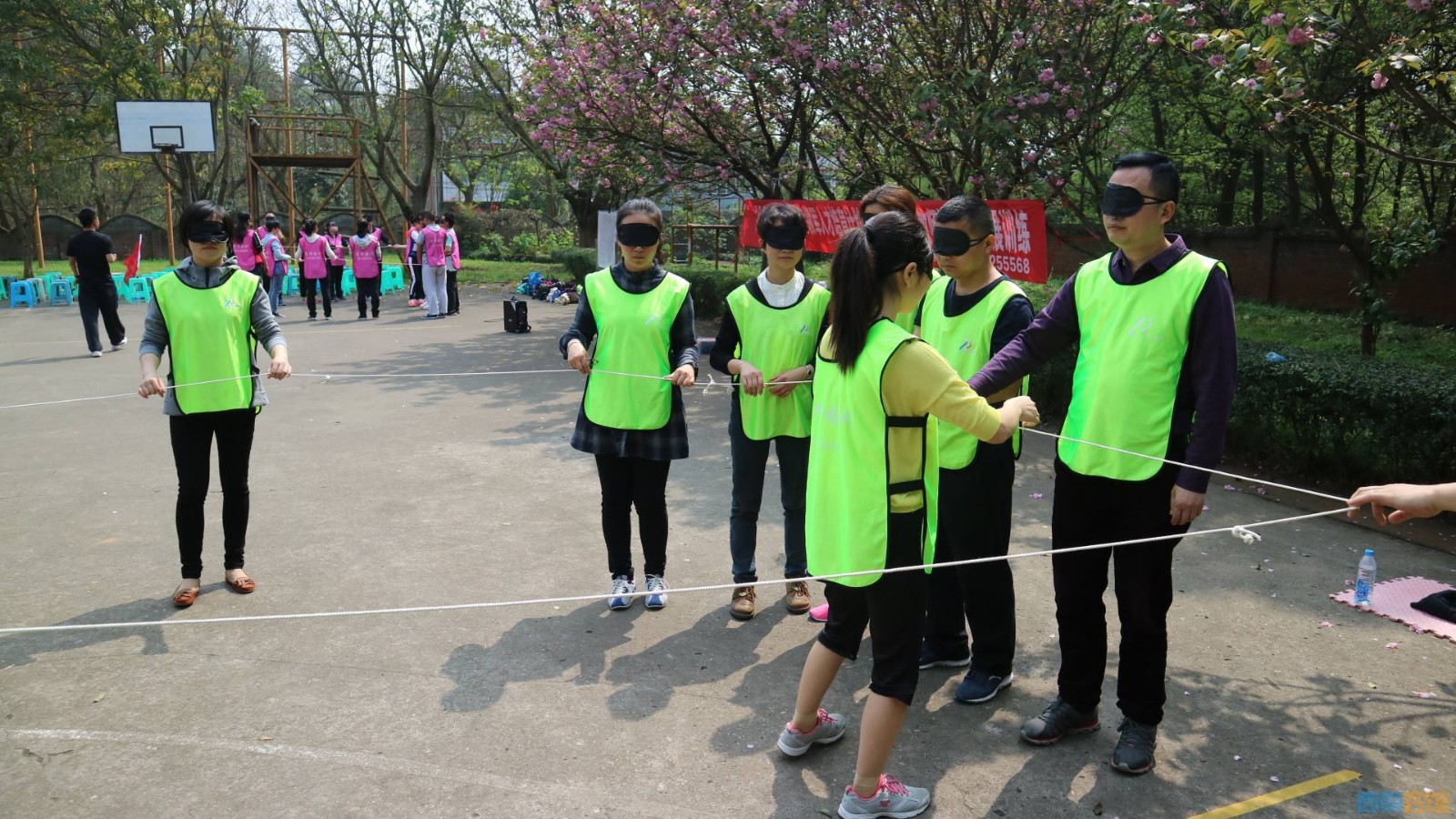 根據(jù)培訓(xùn)師的口令,學(xué)員之間組成不同的組合、隨意組合,兩人面對(duì)面站立,雙手舉起搭成一個(gè)門(mén)洞,扮作大樹(shù),一人蹲進(jìn)這顆大樹(shù)中,扮作松鼠